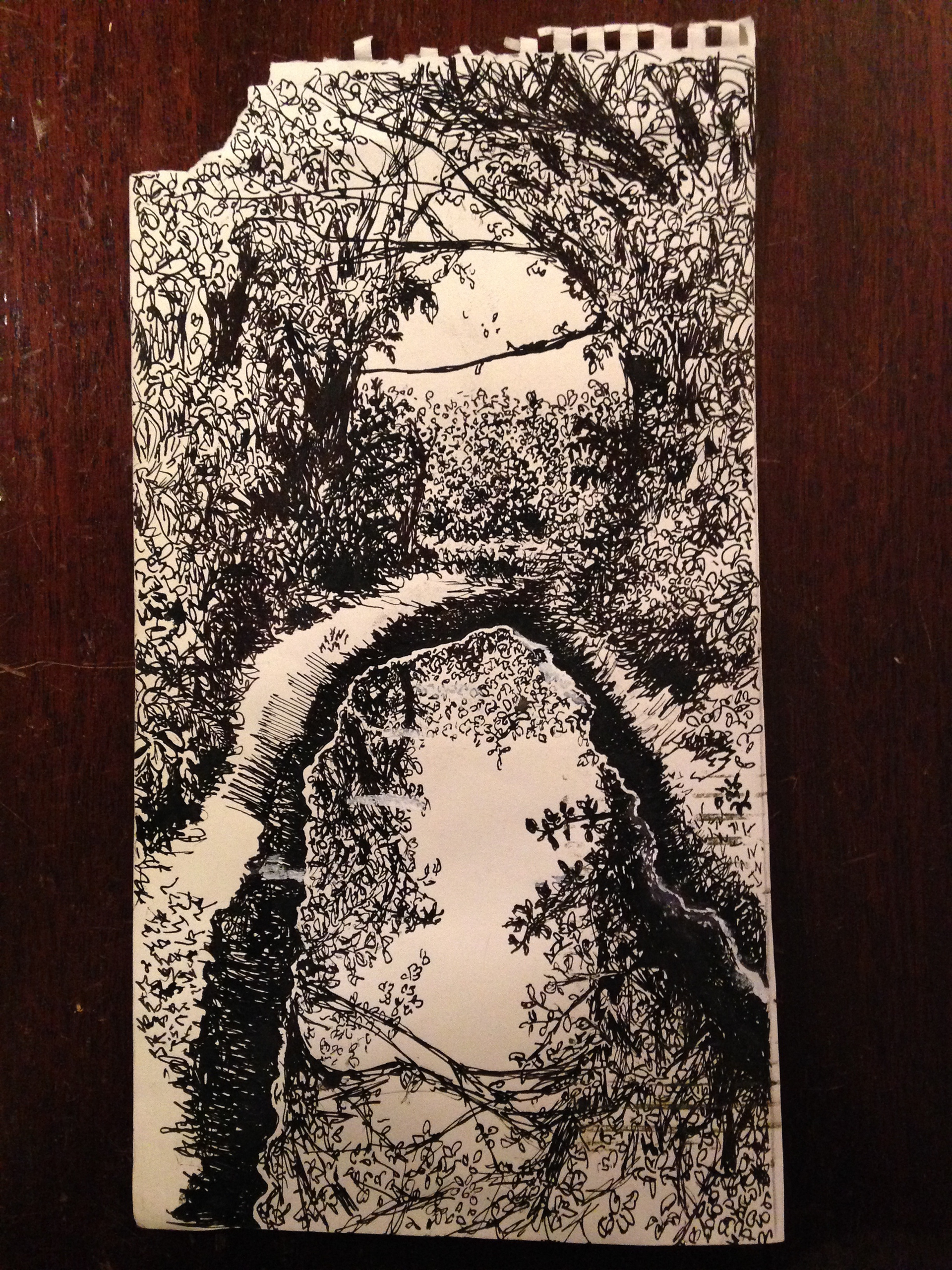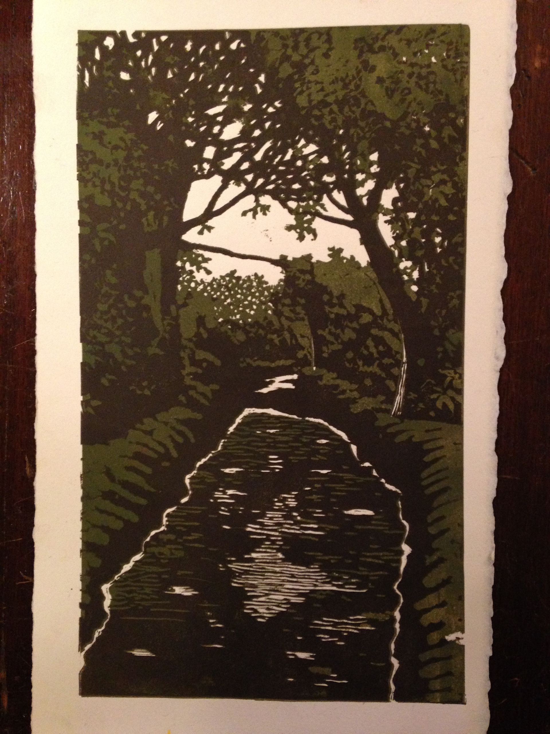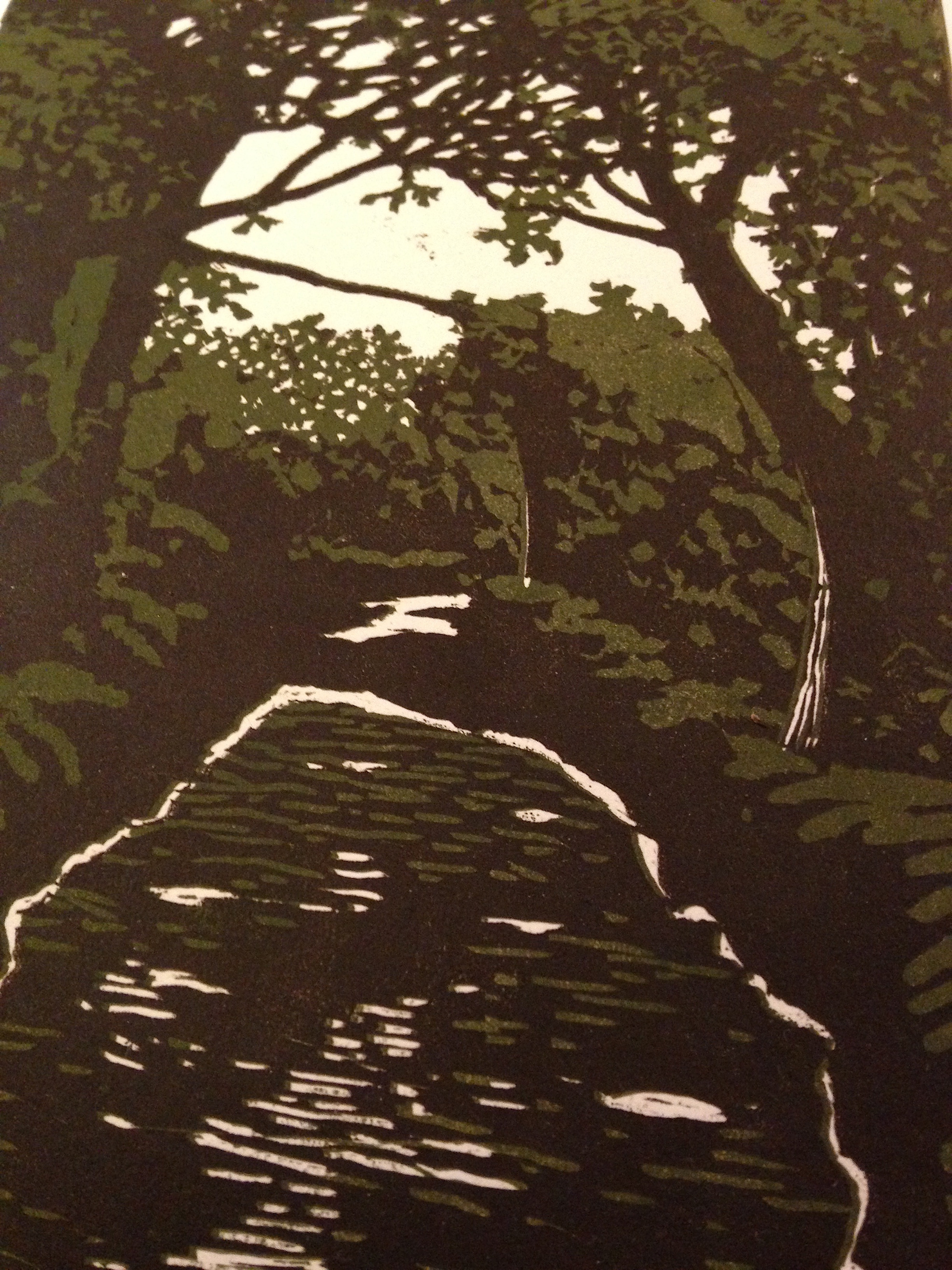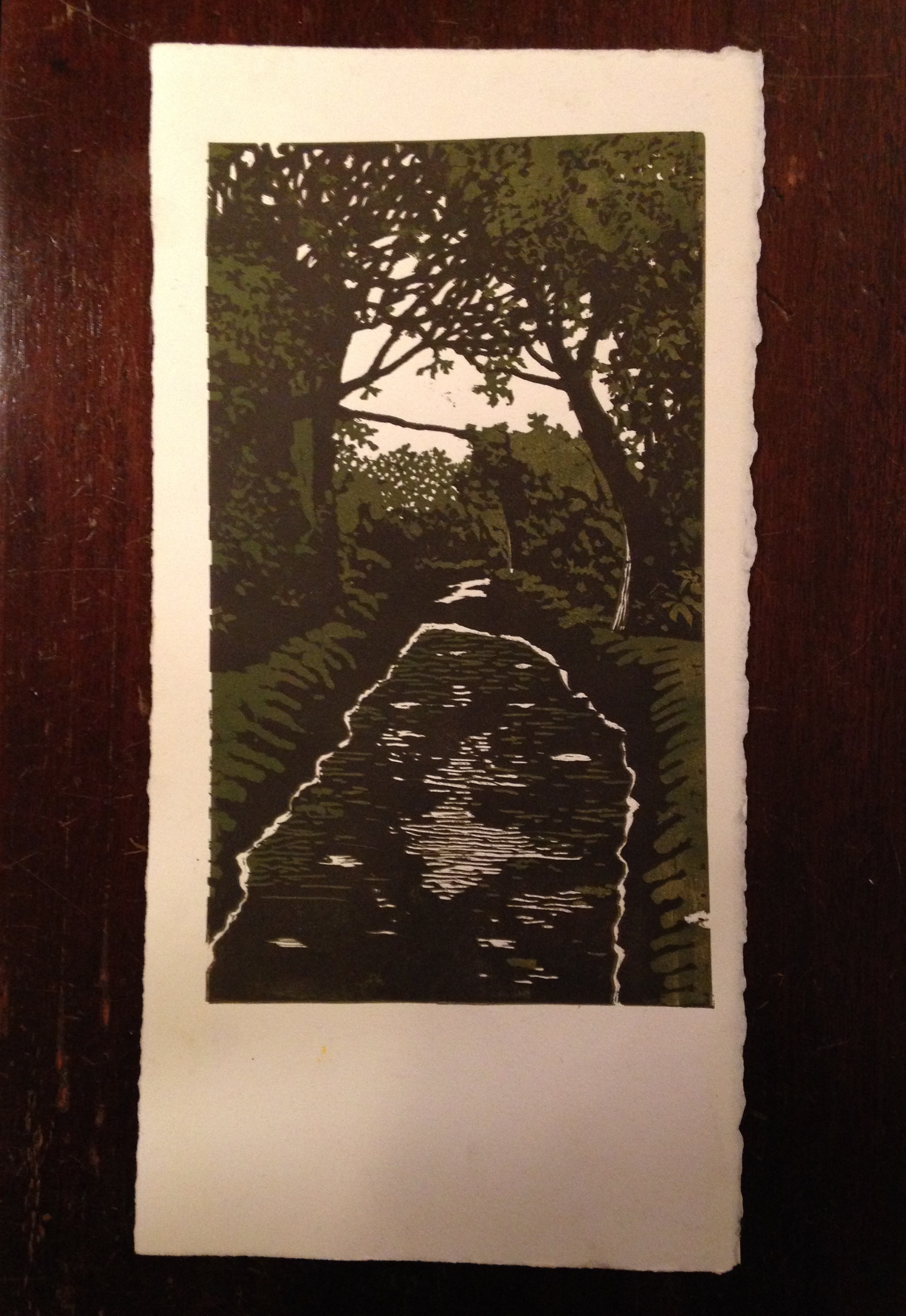 Reduction relief print of part of the trail around Whiskey Lake in California